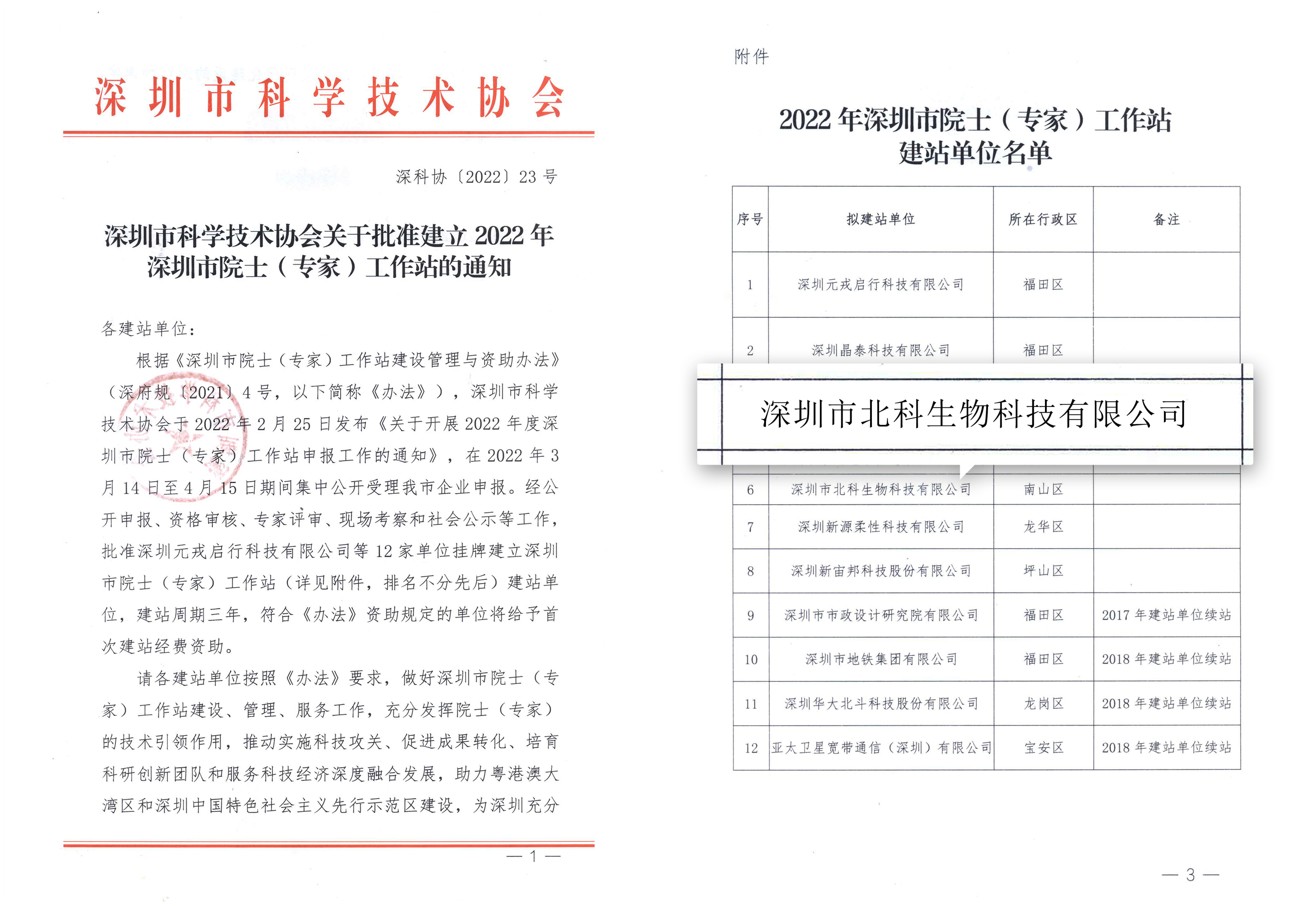 2022年6月27日,深圳市科學(xué)技術(shù)協(xié)會(huì)發(fā)布通知,按照《深圳市院士(專家)工作站建設(shè)管理與資助辦法》(深府規(guī)〔2021〕4號(hào))有關(guān)要求,經(jīng)過公開申報(bào)、資格審核和專家評(píng)審、現(xiàn)場(chǎng)考察和社會(huì)公示等工作,同意深圳市北科生物科技有限公司建立深圳市院士(專家)工作站。